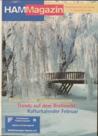 Donnerstag, 29.6. 20 Uhr, Oko-Zentrum Werkhalle Klassik vor Ort: Kronos-Quartett Klang-Revolution von E bis #U VVK: 48,- DM, erm. 38,- DM zzgl. Vvkg. Sonntag, 13.8. 20 Uhr, Maximilianhalle Academy of St. Martin in the Fields Leitung: Sir Neville Marriner Werke von Mendelssohn VVK: 78,-/58,- DM, erm. 58,-/46,- DM zzgl Vvkg. Dienstag, 15.8. 19.30 Uhr, Schloss Ermelinghof Klassik vor Ort: Xylos-Quintett Bach für Holzbläser VVK: 28.- DM. erm. 20,- DM zzgl. Vvkg. Sonntag, 20.8. 19 Uhr, Schloss Oberwerries Klassik vor Ort: Bach im Schloss Kantaten und mehr VVK: 28,- DM, erm. 20,- DM zzgl. Vvkg. Donnerstag, 24.8 20 Uhr, Lokschuppen Klassik vor Ort: Jaques-Loussier-Trio Play Bach again VVK: 48,- DM, erm. 38,- DM zzgl. Vvkg. Donnerstag, 29.8. 20 Uhr, Flughafen-Hangar Klassik vor Ort: Detlef Bensmann & Silesian String Quartett Stilmix VVK: 28,- DM; erm. 20,- DM zzgl. Vvkg. Kulturelle Einrichtungen in Hamm (Vorwahl Hamm: 02381) Kultur- und Touristikbüro, Caldenhofer Weg 159, 59063 Hamm. Tel.: 17-5501 Städtisches Gustav-Lübcke-Museum, Neue Bahnhofstr. 9, 59065 Hamm, Tel.: 17-5701 + 17-5714 Stadtbücherei, Ostenallee 1-5, 59063 Hamm, Tel.: 17-5751 Volkshochschule, Hohe Str. 71,59065 Hamm, Tel.: 17-5632[1] HELIOS THEATER HAMM, Bahnhofstr. 1 b. 59065 Hamm. Tel.: 926837 Singen Sie gern? Der Städtische Chor Hamm sucht Sängerinnen und Sänger in allen Stimmlogen Der Städtische Chor Hamm erarbeitet in kleinen Schritten große Chorwerke und gibt regelmäßig Konzerte. Sie sind herzlich eingeladen zu einer Schnupperprobe mit dem jungen Chorleiter Lothar Mayer: Jeden Dienstag, 19.30 Uhr Bürgersaal in der VHS, Hohe Str. 71 Neugierig? Dann kommen Sie vorbei und singen Sie mit oder rufen Sie doch einfach einmal an. Hubert Schwippe, 1. Vorsitzender, Tel.: 02381/84411 Jazzclub Hamm, Fritz-Erler-Str. 16, 59071 Hamm, Tel.: 870048 Stadtarchiv, Kamener Str. 177, 59077 Hamm, Tel.: 17-5850 Jugendamt. Teichweg 1, 59075 Hamm, Tel.: 17-6374 Städtische Musikschule, Kolpingstr. 1, 59065 Hamm, Tel.: 17-5653 Maximilianpark GmbH Hamm, Alter Grenzweg 2, 59071 Hamm, Tel.: 982100 Westfälische Freilichtspiele e.V., Waldbühne Heessen, Gebrüder-Funke-Weg 3, 59073 Hamm, Tel.: 309090 Kulturwerkstatt e.V., Oberonstr. 20-21, 59067 Hamm, Tel.: 44891 Kulturrevier Radbod, Hammer Str. 152, 59075 Hamm, Tel.: 599626 Tanzwerkstatt/Tanztheater Anke Lux, Römerstr. 18, 59075 Hamm. Tel.: 978123 Offener Kanal Hamm, Oberonstr. 20-21, 59067 Hamm, Tel.: 417280 Veranstaltungshäuser (Vorwahl Hamm: 02381) Saalbau Bockum-Hövel, Overbergstr. 14, 59075 Hamm Schloß Heessen, Schloßstr. 1, 59073 Hamm Bürgersaal, Hohe Str. 71, 59065 Hamm, Tel.: 17-9140 Stadtbücherei, Ostenallee 1-5, 59063 Hamm, Tel.: 17-5751 Museums-Forum, Neue Bahnhofstr. 9, 59065 Hamm, Tel.: 17-5701 + 17-5714 Stadthaus Galerie, Museumsstr. 2, 59065 Hamm Musikschule, Kolpingstr. 1, 59065 Hamm, Tel.: 17-5651 Maximilianhalle/Werkstatthalle, Alter Grenzweg 2, 59071 Hamm, Tel.: 982100 Waldbühne Heessen, Gebrüder-Funke-Weg 3, 59073 Hamm, Tel.: 309090 Kulturwerkstatt/HoppeGarden, Oberonstr. 20-21, 59067 Hamm, Tel..: 44891 und 417075 JZ Südstr. 28, 59065 Hamm, Tel.: 17-6381/2/3 JZ Rhynern, Unnaer Str. 14 a, 59069 Hamm, Tel.: 17-6386 JZ Uentrop, Alter Uentroper Weg 174, 59071 Hamm. Tel.: 81721 Jazzclub Hamm, Bockumer Weg 280, 59075 Hamm, Tel.: 64856 Vorverkaufsstellen für städtische Veranstaltungen Verkehrsverein Hamm e.V., Willy-Brandt-Platz, 59065 Hamm, Tel.: (02381) 23400 Öffnungszeiten: montags bis freitags 9-18 Uhr, samstags 9-13 Uhr Kultur- und Touristikbüro, Postfach 2449, Caldenhofer Weg 159, 59063 Hamm, Tel.: (02381) 17-5555 Öffnungszeiten: montags bis freitags 8.30 - 12.30 Uhr, mittwochs 8.30 - 12.30 u. 14 - 15.30 Uhr (im Rahmen von „Happy Hour" bis 17.00 Uhr) Ticket Corner, Oststr. 47, 59065 Hamm, Tel. (02381) 926155 Öffnungszeiten: montags bis freitags 10.00 - 18.00 Uhr, sams- tags 10.00 - 13.00 Uhr Westfälischer Anzeiger, Gutenbergstr. 1, 59065 Hamm, Tel.: (02381) 105-313 Herausgeber: Stadt Hamm, Der Oberstadtdirektor, Kultur- und Touristikbiiro Redaktion und Ansprechpartner: Ingrid Hadamczik, Tel.: (02381) 17-5556, Fax (02381) 17-2901 e-mail: hadamczik@stadt.hamm.de Redaktionsschluss Ausgabe März: 10.2.2000 Änderungen vorbehalten. Alle Angaben ohne Gewähr.